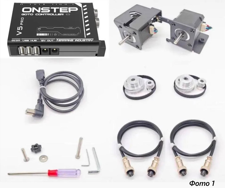Итак, заказан комплект Onstep goto controller,V5 Pro,EXOS2/CG5/EQ5 и через три недели ожидания он оказался у меня. Комплектация устройства показана на (фото_1).