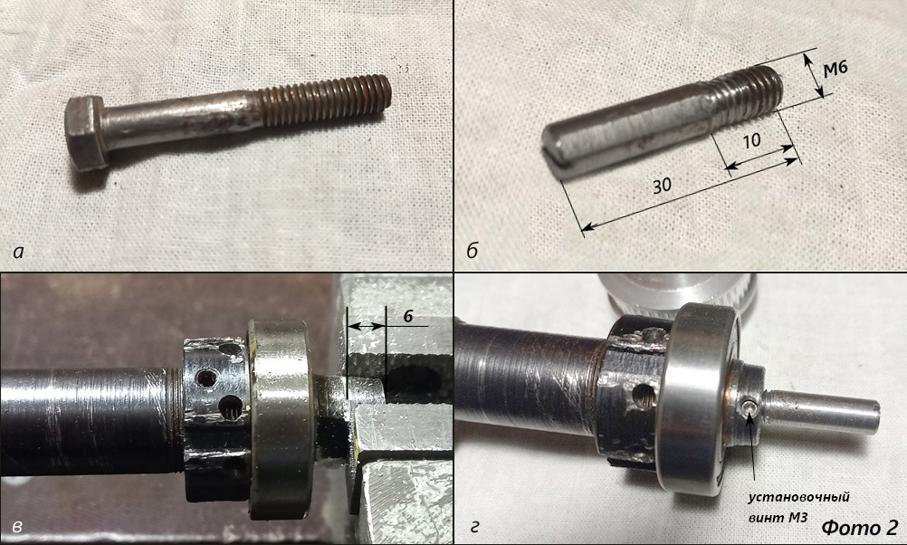 Чтобы уменьшить вынос шкива относительно коробки редуктора часовой оси (RA), коническую часть вала червяка лучше укоротить на 6 мм (фото_2в) и просверлить отверстие под резьбу М3 для установочного винта (фото_2в,г).
