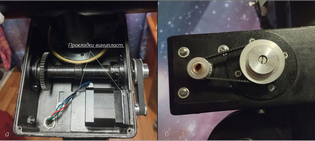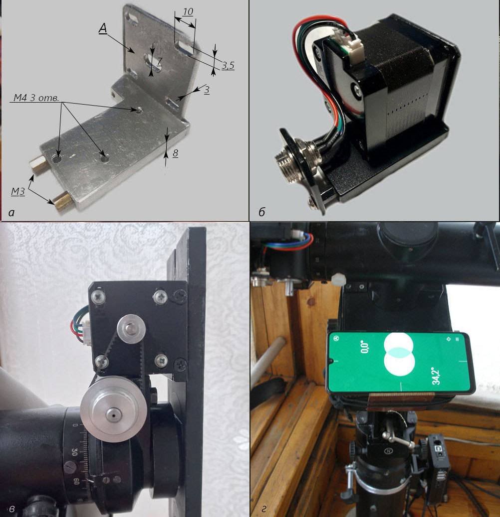 Деталь (А) кронштейна, в свою очередь, является шаблоном изготовления отверстий в корпусе редуктора оси RA. Двигатель оси склонения устанавливается на кронштейн с помощью четырёх винтов М3(фото_4б) и крепится к установочной пластине монтировки вплотную к корпусу червяка этой оси (фото_4в) тремя винтами М4. В приводе DEC используются комплектные шкивы Z16 и Z48. Отверстие 6мм в шкиве Z48 необходимо рассверлить до 7 мм. В данном приводе используется ремень 2GT-6 длиной 144 мм. После установки приводов монтировка была приблизительно ориентирована по меридиану и с помощью смартфона выставлена по вертикали и широте (фото_4г)