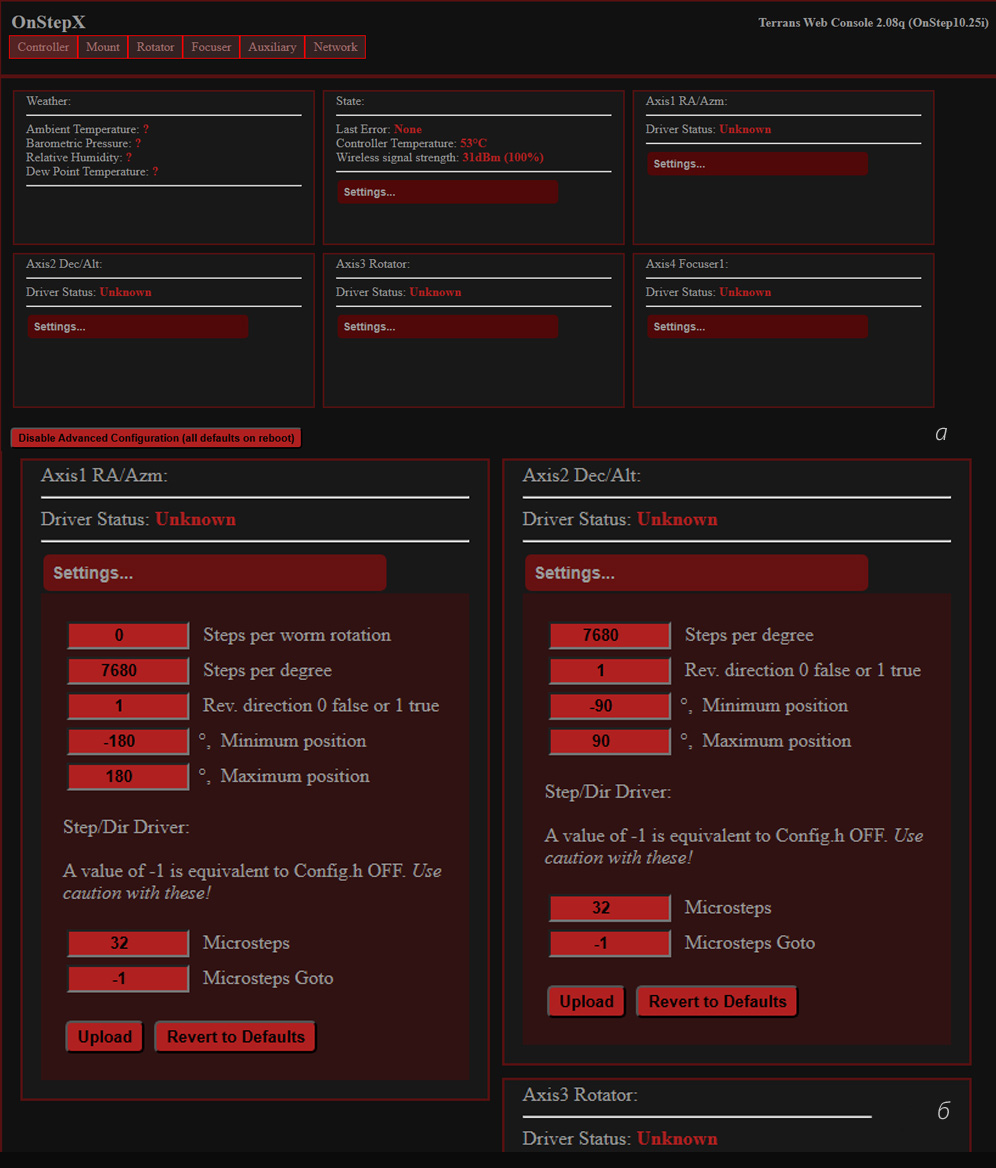 https://www.terransindustry.com/pages/copy-of-download и вручную выставляем голову монтировки в положение когда её часовая ось направлена на Северный полюс мира. Это будет стандартная домашняя позиция. Подключаем блок управления и заходим в настройки смартфона. В разделе подключения WiFi-Доступные сети находим сеть TerransOnStep и устанавливаем эту сеть без доступа в Интернет вместо своей домашней сети инициируем кнопку Подключаться автоматически. Далее заходим в приложение OnStep Controller (фото_6б)