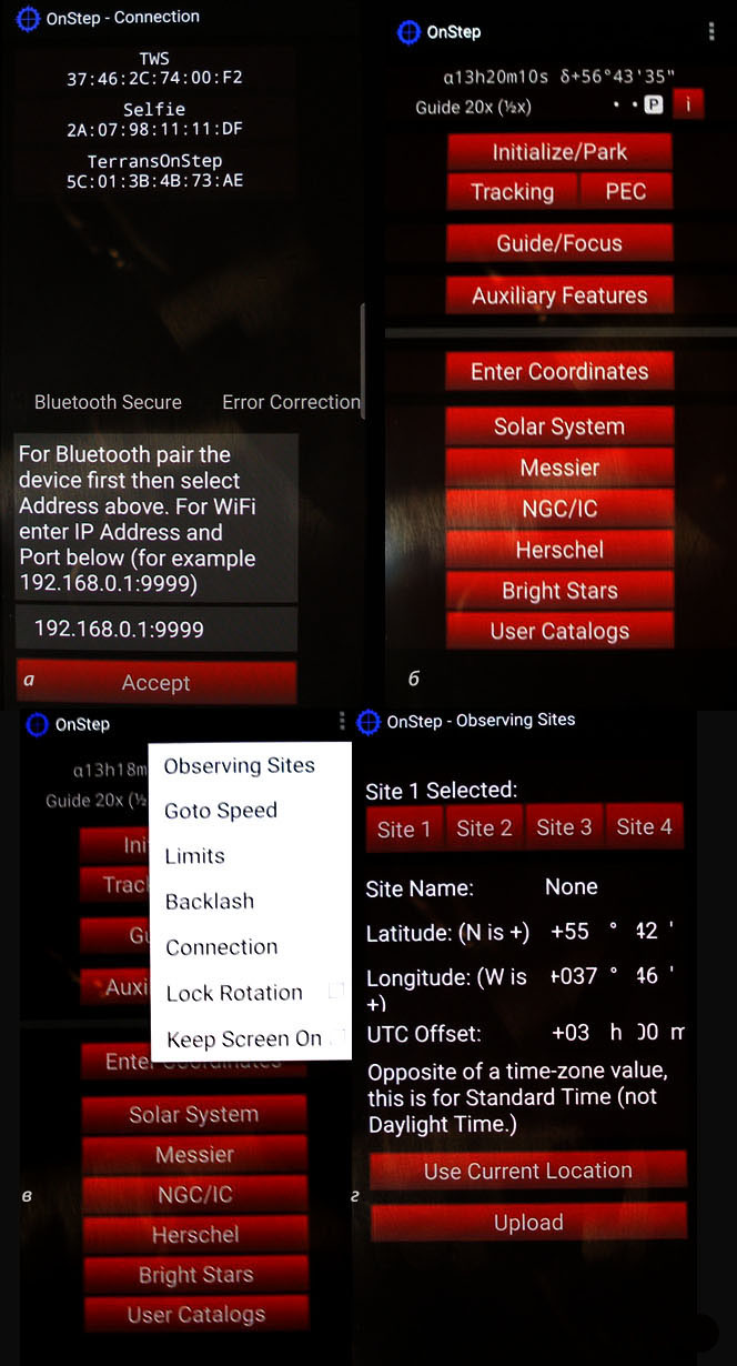 и нажимаем на три точки в правом верхнем углу. Открывается белая панель с настройками (фото_6в) и открываем Connection , проверяем подключение (фото_6а). В дальнейшем эта операция не понадобится. Возвращаемся к белой панели (фото_6б) и устанавливаем координаты расположения монтировки Observing Sites-Use Current Location. Более подробно о процессе подключению и управлению OnStep можно почитать и посмотреть на сетевых ресурсах , например на сайте известного эксперта-любителя астрономии Эдуарда Важорова -